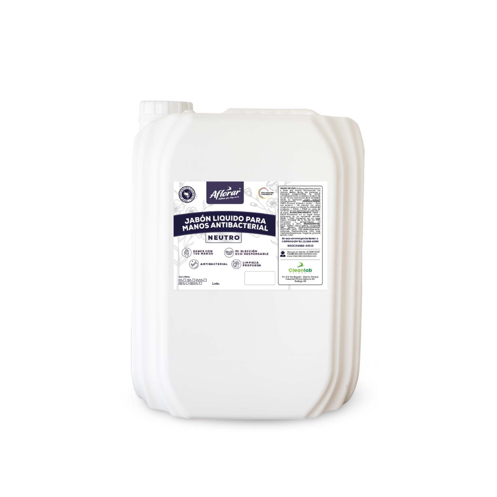 El Jabón Líquido para Manos Antibacterial Neutro Aflorar * 20 L es un jabón líquido desinfectante, biodegradable, ideal para la limpieza y suavidad en las manos, contiene agente antibacterial de origen natural. Con un buen uso previene enfermedades que se pueden transmitir mediante contacto con personas, superficies, objetos y alimentos.