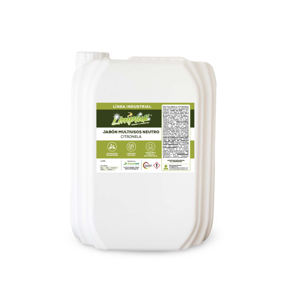 Volver a la tiendaEl Jabón Multiusos Neutro Citronela Limplux * 20 L es ideal para utilizar en el lavado de los pisos, especialmente en superficies tratadas con ceras o selladoras autobrillantes.