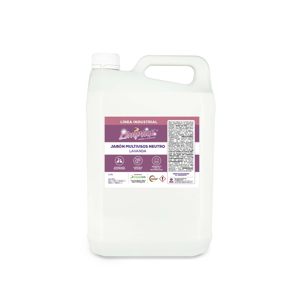 Volver a la tiendaEl Jabón Multiusos Neutro Lavanda Limplux * 3.785 ML es ideal para utilizar en el lavado de los pisos, especialmente en superficies tratadas con ceras o selladoras autobrillantes.